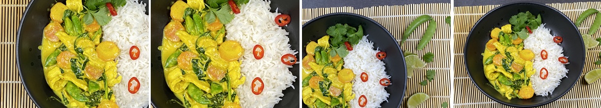 Anret retten i dybe tallerkener/skåle sammen med ris og drysset med chiliskiver og koriander/basilikum. Server limebåde til