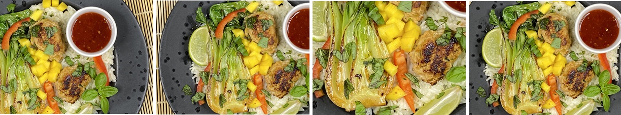 - Anret risene på tallerkener og top med kyllingedeller, pak choy, mango, rød peber, koriander eller basilikum samt limebåde