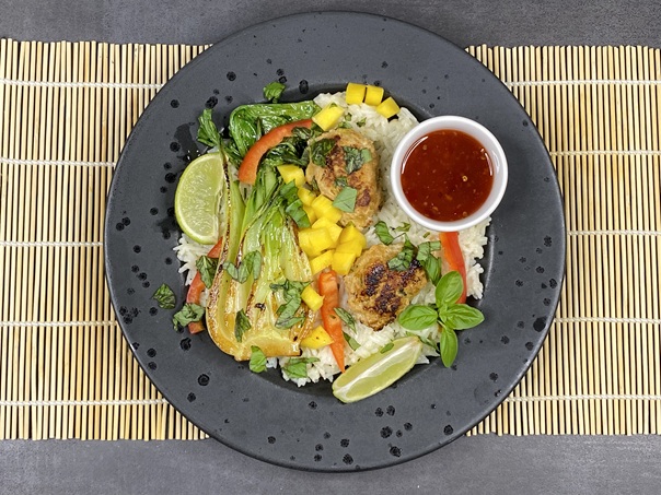- Anret risene på tallerkener og top med kyllingedeller, pak choy, mango, rød peber, koriander eller basilikum samt limebåde
