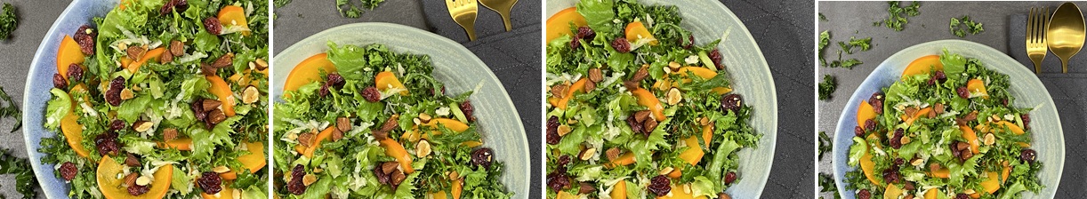 Grønkålssalat med kakifrugt er en herlig efterårssalat, da denne årstid er sæson for kakifrugt (som også kaldes Sharonfrugt, selvom det er to forskellige frugter). Kakifrugten giver en dejlig sødme sammen med de tørrede tranebær og komplementerer grønkålen utrolig godt. Salaten passer perfekt som tilbehør til de retter, du normalt serverer salat til, eller du kan servere den som en frokostret med lækkert brød til