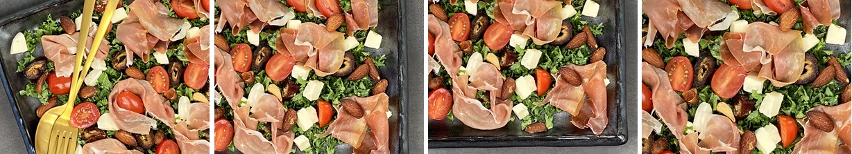- Fordel skinken på salaten og drys med de saltede mandler