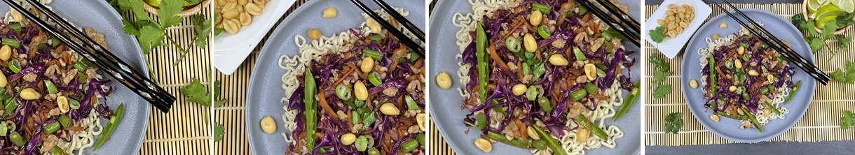 Server retten ovenpå nudler, drysset med det grønne af forårsløgene, saltede peanuts/cashewnødder samt limebåde ved siden af