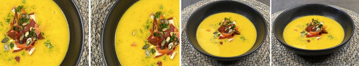 - Inden servering toppes suppen med serranoskinke, som du brækker i små stykker, æbletern, strimler af rød peber, de ristede græskarkerner og evt lidt hakket persille