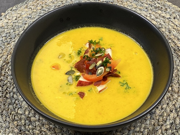 - Inden servering toppes suppen med serranoskinke, som du brækker i små stykker, æbletern, strimler af rød peber, de ristede græskarkerner og evt lidt hakket persille
