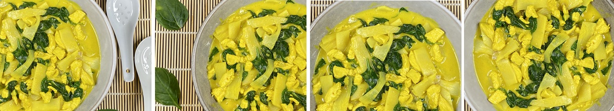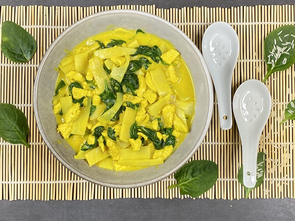 Kylling med spinat i gul karry er en super nem, thai inspireret ret, hvor jeg bruge karrypulver i stedet for den typisk brugte karrypasta. Der findes super mange forskellige, især indiske, karrypulvere. Det, der adskiller den thailandske karrypulver fra de indiske, er at den indeholder citrongræs og ingefær. Du kan sagtens bruge en af de indiske karrypulvere til retten, hvis ikke du kan finde en thai karrypulver. Du kan så evt, sammen med løg, hvidløg og chili, riste en stængel fintsnittet citrongræs samt en spsk revet ingefær eller 1 tsk stødt ingefær. Men du får en fin karrysmag, hvis du blot bruger en indisk karrypulver