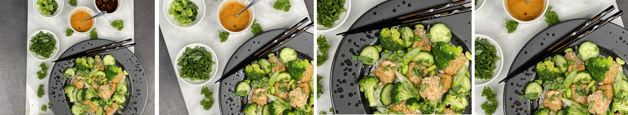 - Anret de kogte ris på tallerkener eller i skåle, fordel laksestykkerne og grøntsagerne herpå