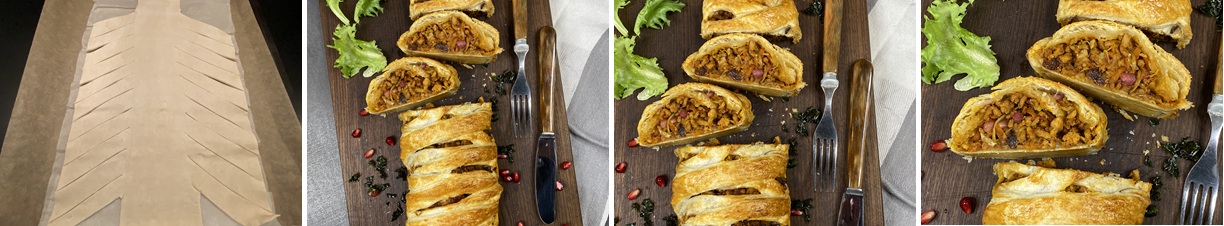 - Fold enderne af butterdejen ind over fyldet og fold derefter strimlerne ind over fyldet, skiftevis fra den ene og den anden side