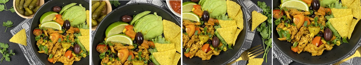 - Kom salaten i bunden af 4 serveringsskåle og fordel majs, bønner, tomater og peber ovenpå