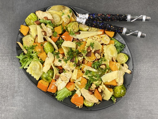 Raviolisalat med hokkaido-græskar og kylling er en herlig efterårs salat. Hokkaidoen bliver bagt sammen med halverede rosenkål, kyllingen bliver stegt og tortellinierne bliver kogt. Det hele samles til en lækker måltidssalat med crisp-salat, saltede mandler, ost samt en skøn og enkelt dressing. Du kan lade alle ingredienserne køle af, som jeg gør, men salaten kan også nydes lun. Du kan bruge den variant af ravioli, du har mest lyst, med eller uden kød. Jeg vælger altid en variant uden kød til denne salat, da en af ingredienserne i salaten er kylling. Salaten er fyldig og mættende med både ravioli, kylling og hokkaido, og er derfor velegnet som en måltidssalat. Du kan også udelade kyllingen og servere salaten til grill, til fisk, til kød, til frikadeller eller hvad, du har lyst til. Eller du kan servere salaten som en vegetarsalat fx med brød til. Ravioli kan udskiftes med tortellini, hvis de har fyld, du hellere vil have. Bliver der en rest, er den velegnet som frokost