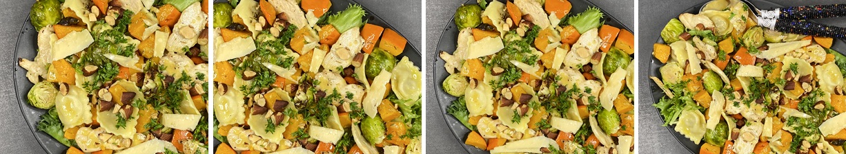 - Fordel ravioli, kylling, salat, hokkaido og rosenkål på et fad og dryp dressingen over