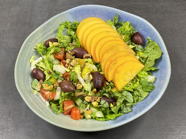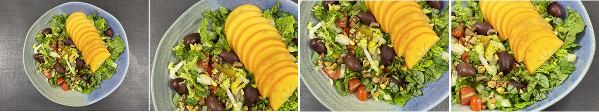 - Skyl kakifrugt, halver den, skær den i tynde skiver og anret den på salaten