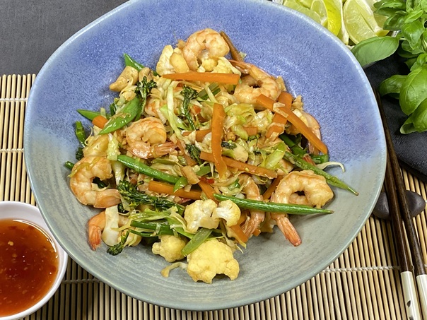 Stir-fry med rejer og grøntsager er en super nem, asiatisk inspireret ret. Der er masser af grøntsager i retten, som skal snittes, men det er det værd, når du kan servere den færdige ret med sprøde, sunde og lækre grøntsager. Har du ikke tid til at lade rejerne marinere et par timer, kan du lade dem marinere mens du snitter. Du kan bruge rå tigerrejer, eller du kan bruge kogte vannamei rejer fra frost, som du så lige skal tø op først
