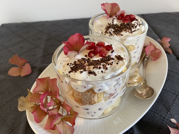 Trifli med tranebær og granatæble er en super skøn og nem dessert. Da jeg bruger tranebær og granatæblekerner, har jeg vendt disse i fløde-yoghurtcremen i stedet for, som i en klassisk trifli, at lægge bærrene i lag med 'kage' og creme. Har du ikke lyst til at bruge alkohol til at dryppe over dine Ladyfingers, er et godt alternativ at bruge frugtsaft i stedet. Jeg drypper dessertvinen ned i bunden af glassene, så det nederste lag Ladyfingers suger det meste og bliver dejlig svampede. Det næste lag Ladyfiners drypper jeg ikke, så de forbliver (næsten) sprøde. Du kan købe løse granatæblekerner, hvis du synes, det er nemmere end selv at pille kernerne ud af æblet. I Nettos bægere med granatæblekerner er der 80 g, så to bægere passer fint. Du kan lave triflien lige inden den skal serveres, så de øverste Ladyfingers stadig har 'bid', eller du kan lade triflien hvile, så Ladyfingers bliver bløde