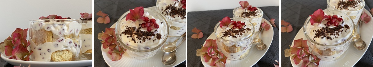 - Bræk 4 Ladyfingers i grove stykker, læg disse i bunden af de fire glas og dryp 2 spsk dessertvin ned i bunden af hver glas (Ladyfingers suger dessertvinen)